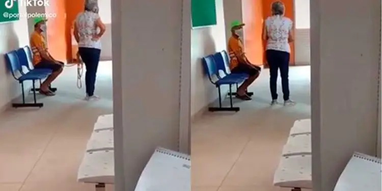 En el video, que dura 17 segundos, se observa al sujeto sentado en una silla esperando su turno para aplicarse la vacuna. De pie una mujer tiene el control y, con porte de guardián, custodia a su ‘preso’ para que no logre escapar. Además, lleva una mano en la soga y la otra en la cintura.
